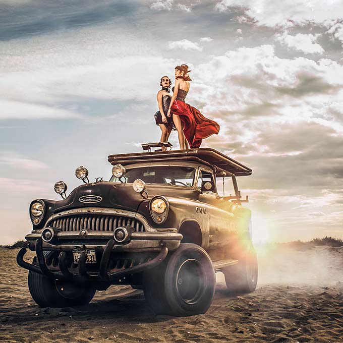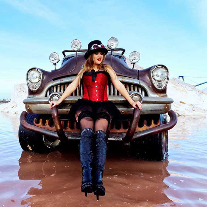This theatrical-themed car is robustly made with a post-apocalyptic aesthetic that gives the appearance of it being created from recycled objects