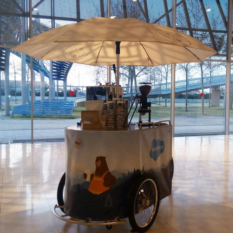 Our mobile coffee bike is based in Barcelona and is available to attend events throughout Spain. Serving freshly roasted coffee with a special blend of beans from Brazil, Central America, and India. 100% Arabica, it has a bold and refined taste.