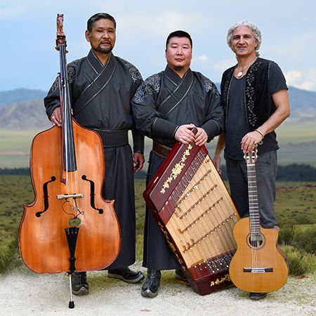 Available as a trio or quartet, the group plays guitar, double bass, dulcimer, frame drum, fiddle, cajón blended with throat and overtone singing