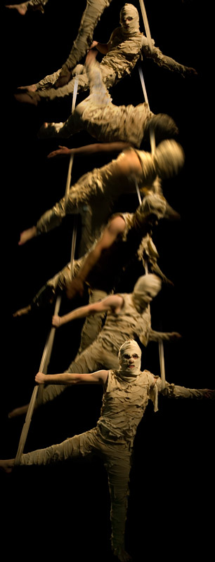 Using an innovative form of aerial circus skills known as a strapeze, the mummy aerial act offers one-of-a-kind visual entertainment. This uncanny aerial show leaves audiences in awe as a suspended mummy comes to life right before their eyes.