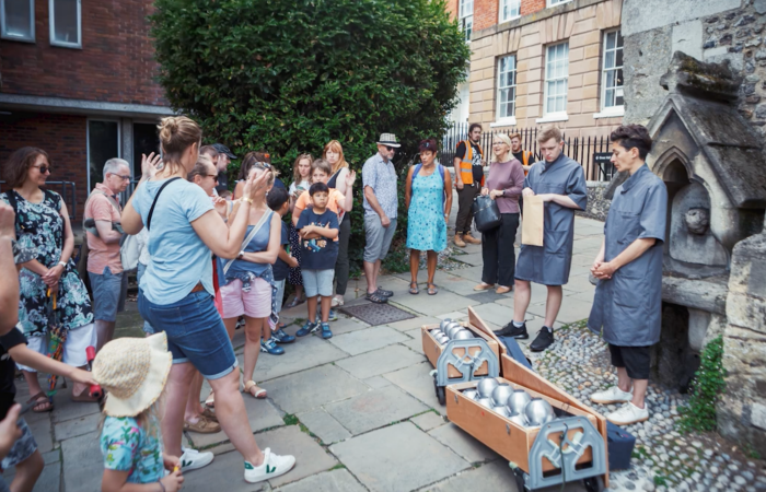 This interactive art experience invites colleagues, families, and visitors to join forces in creating a collaborative masterpiece using "singing spheres."