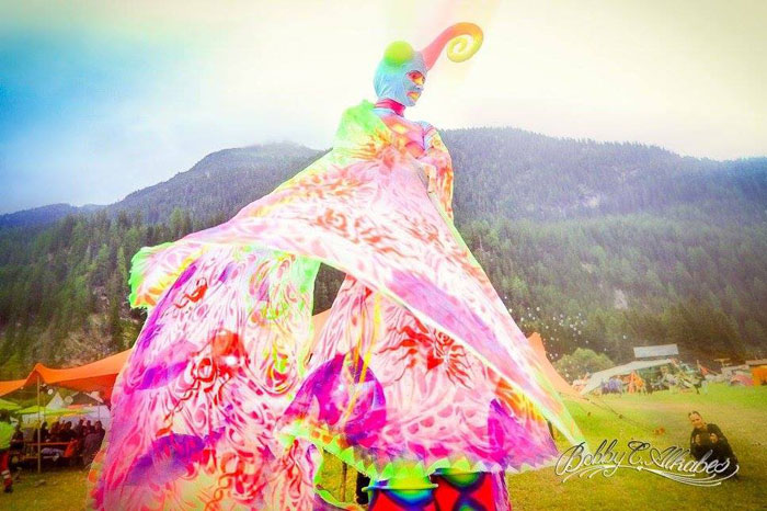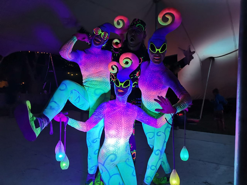 The roaming Psychedelic UV Act is perfect for engaging audiences. These bizarre characters move around using dance and acrobatic skills, forming all kinds of weird and wonderful shapes along the way. The roaming UV act also interacts with and responds to the reactions of the people around them.