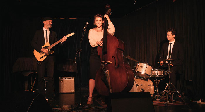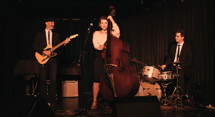 Our retro Jazz trio is fronted by an exceptionally talented and highly experienced female singer and double bass player, currently one of Australia’s favorite jazz musicians. She is a multi-instrumentalist who plays the double bass, cello, or bass guitar while singing her heart out with an absolutely incredible, powerful, and versatile voice. A graduate of the Sydney Conservatorium of Music, she has performed around the world at venues such as the Sydney Opera House, London’s Ronnie Scott’s, and the B.I.M. Institute in Amsterdam.