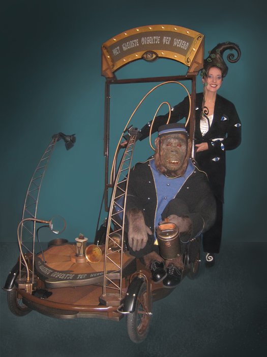 Our roaming monkey character and his handler are available for two different interactive performances. The lifelike monkey can be positioned inside or at the entrance of your event as a meet and greet entertainer. Acting as a bell monkey, he creates humorous situations and plays with guests. The second is a walkaround act suitable for larger venues or bigger open spaces. The lifelike monkey sits on a small cart moved around by his handler. On the cart is the world’s smallest organ, visible through a magnifying glass, that plays music as the walkaround act moves. The interactive performance involves the roaming monkey character causing a scene and playing around with the audience while the handler tries to keep him under control.