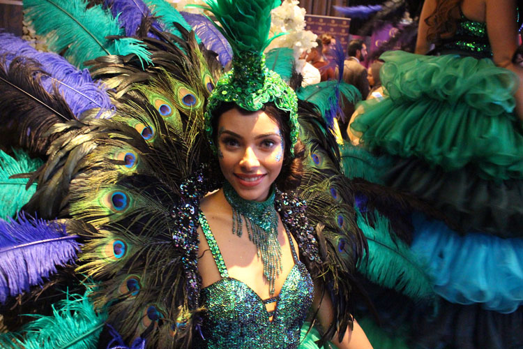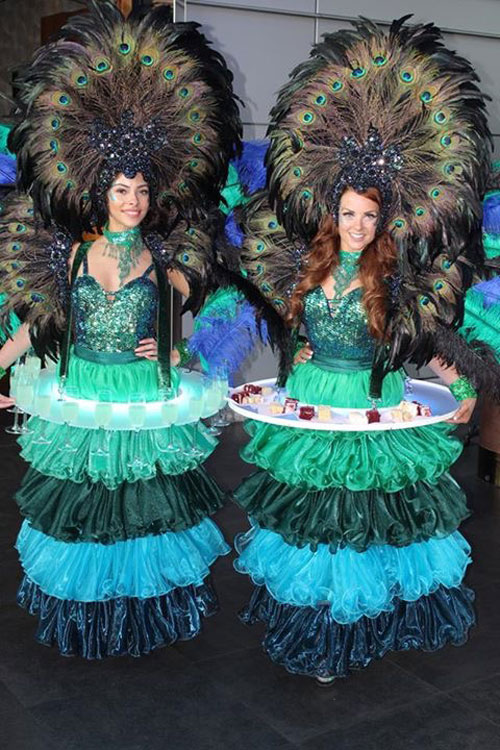 Our glamorous roaming peacock performers light up every event as they glide around your venue, shaking their beautiful feathers and interacting with guests. Guaranteed to capture everyone's attention, our peacock walkabout act is also available with matching strolling tables, peacock showgirls, a male peacock act, and strolling champagne reception with promotional peacock models.