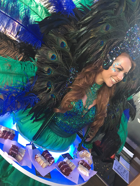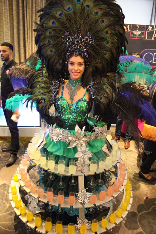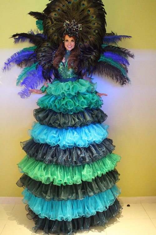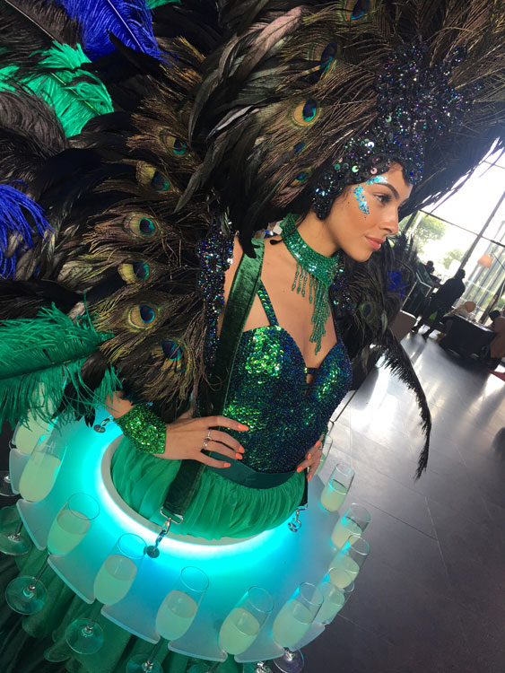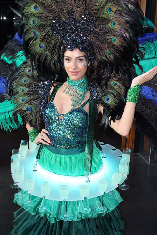When you book all of our peacocks together, you can sit back and relax as our peacock stilt walkers roam around posing for photos and instantly adding to your décor. Alongside our strolling tables and peacock champagne dresses serving your guests all night long, we ensure everyone has a fabulous time. Finally, to tie it all together, our promotional models and male peacock act can welcome your guests, mingle, and shake their tail feathers on the dance floor with your guests!