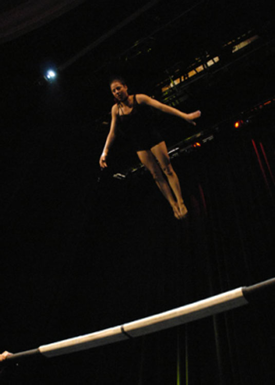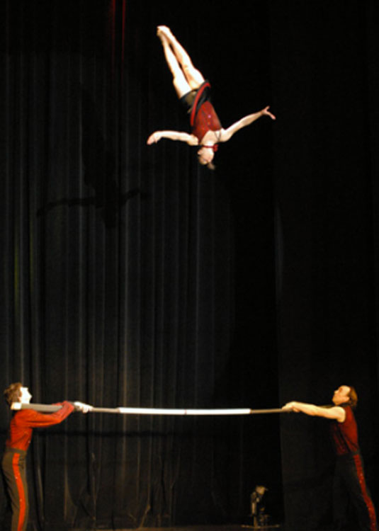 During the routine, our two male performers stand at either end of the Russian bar, balancing it on their shoulders while our female acrobat somersaults, backflips, twirls, and dances in mid-air, rebounding off the bar into her next daring move.
