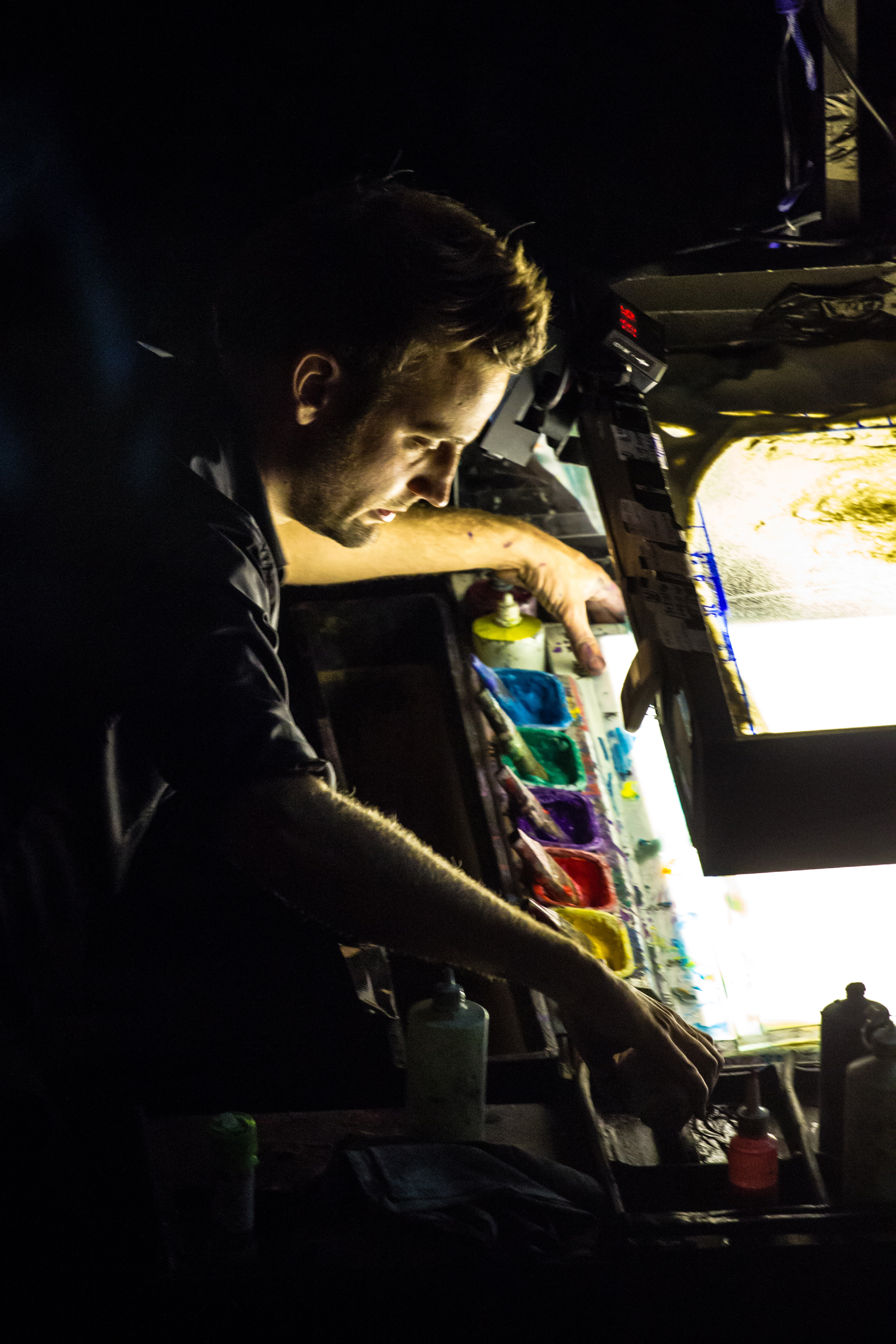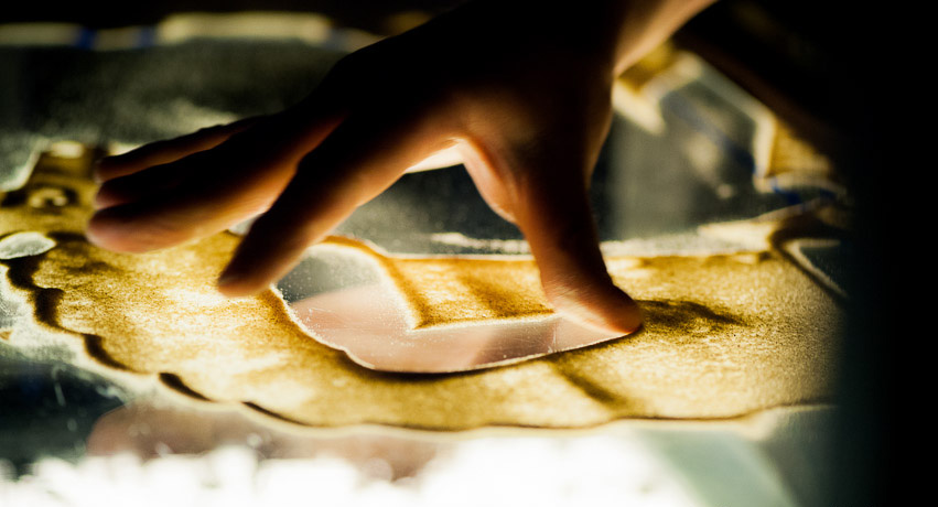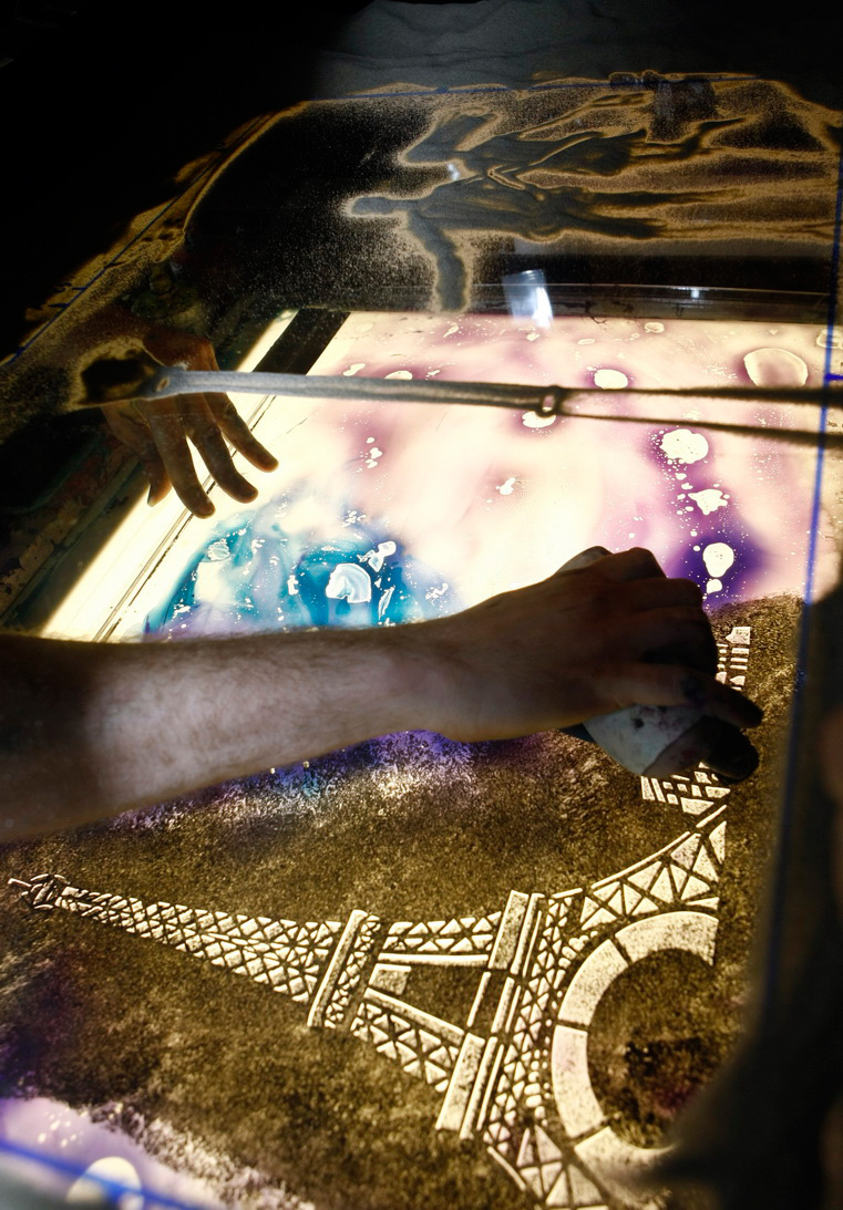 Wet paint, dry sand, two glass plates, music, light, and two people. An array of unlikely elements brought together by two visual artists who craft innovative performances that captivate audiences. Unlike other sand artists, this duo collaborates to create expressive modern art during their high-energy live shows.