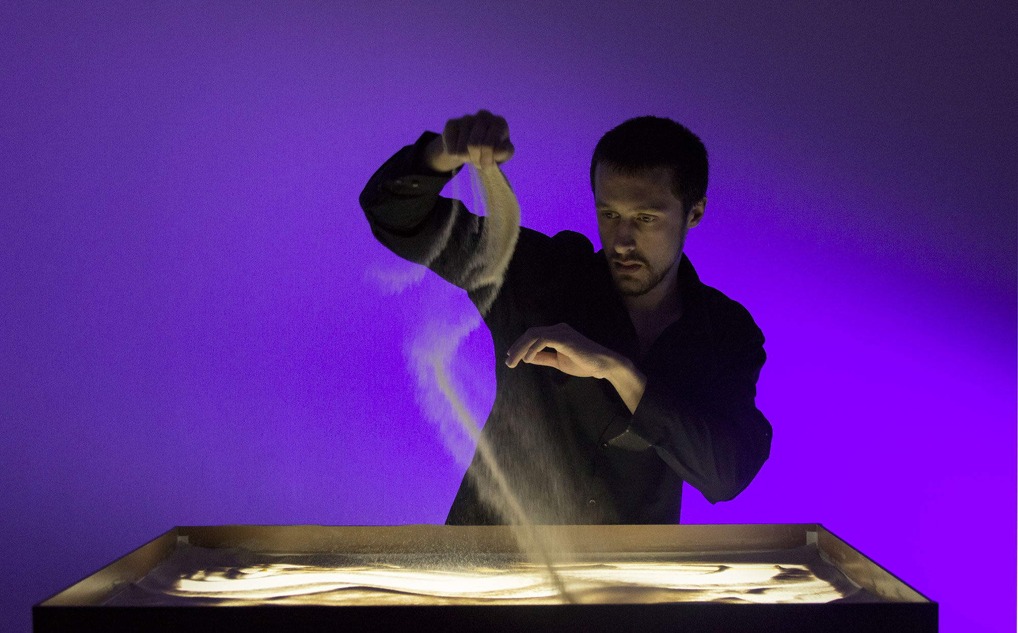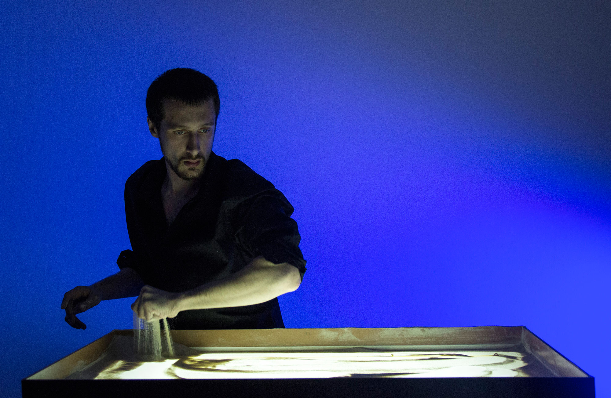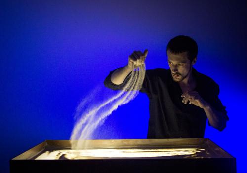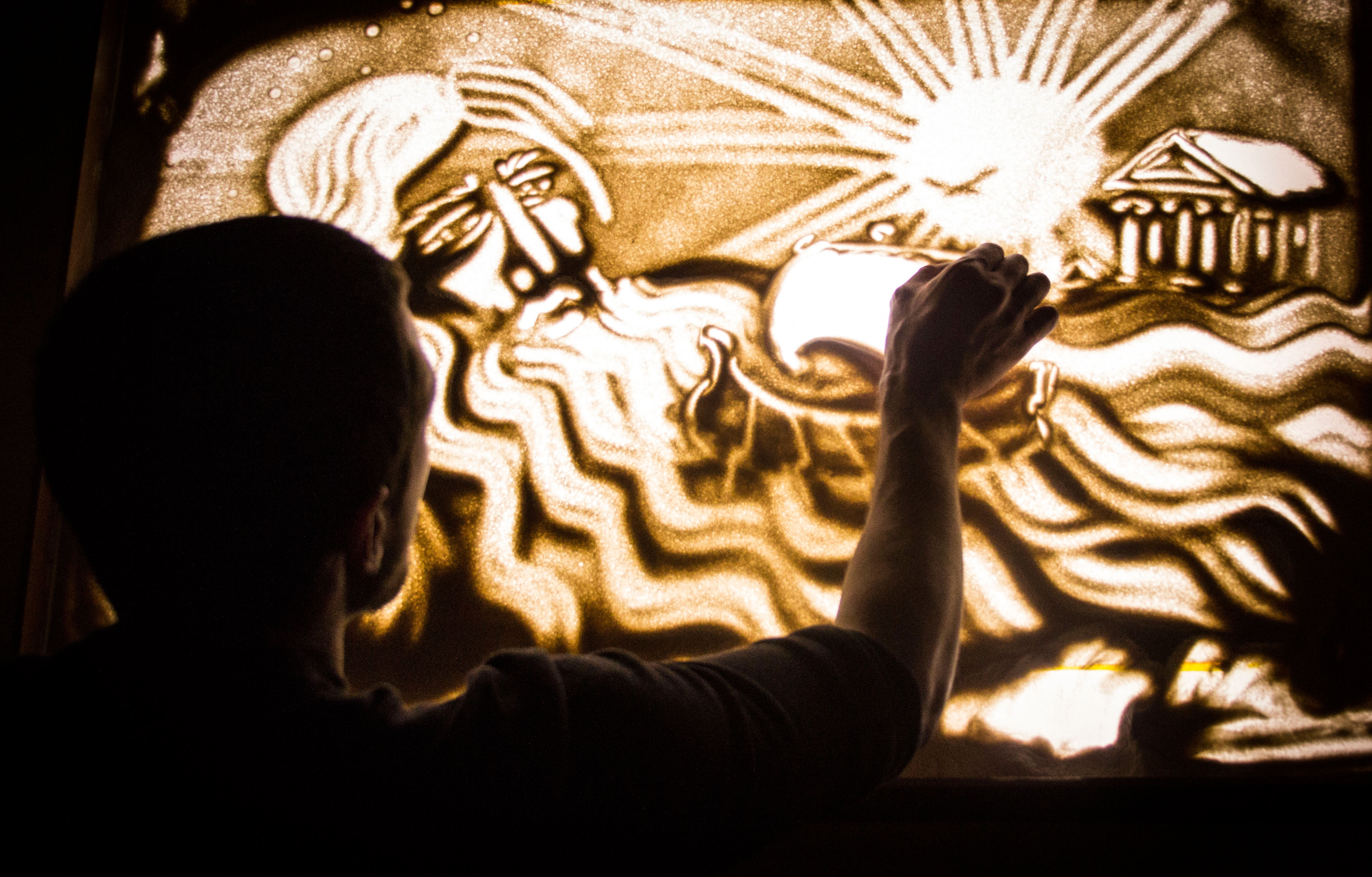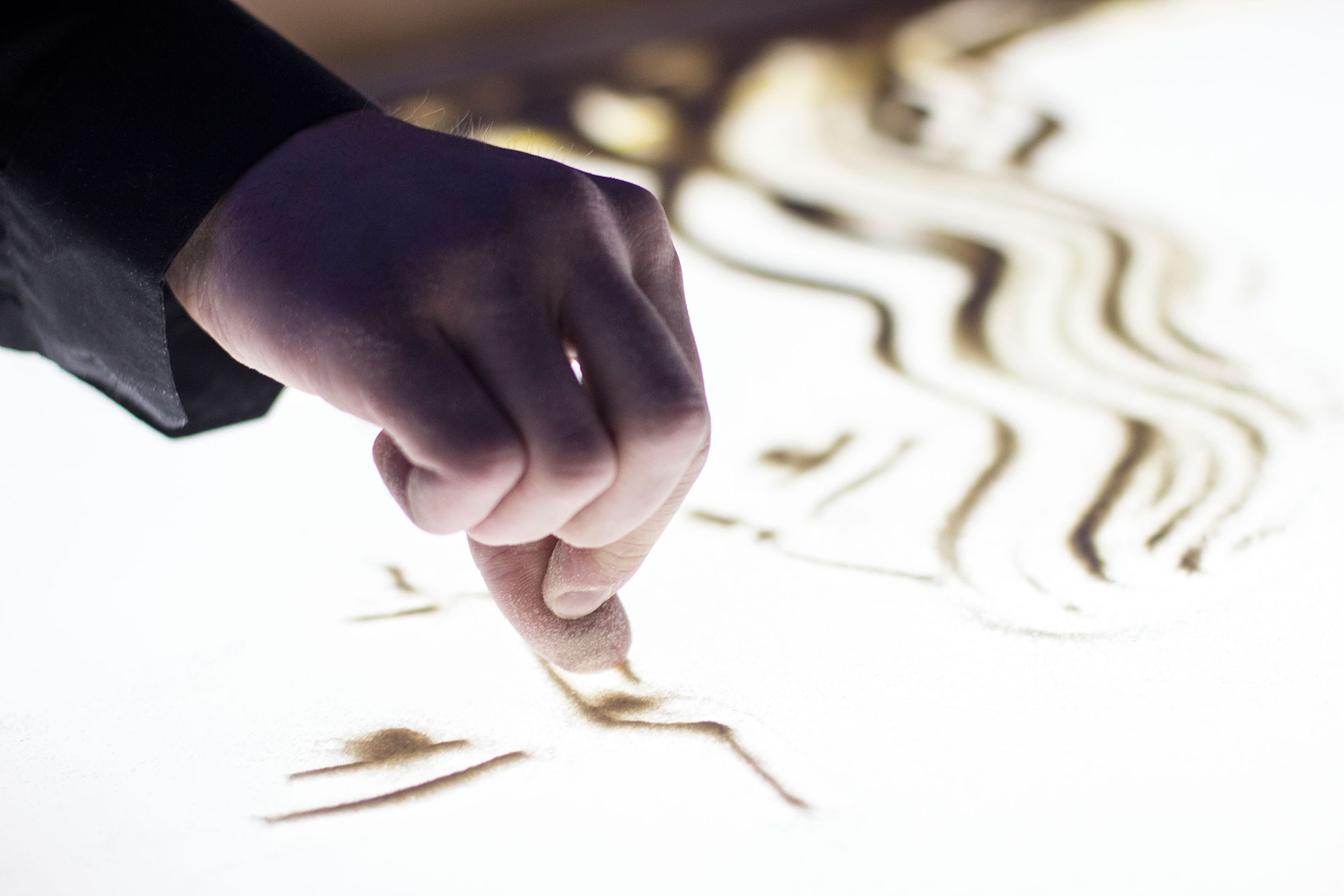 Sand art, ephemeral by nature, is created by layering sand over a light box and drawing images to tell a story.