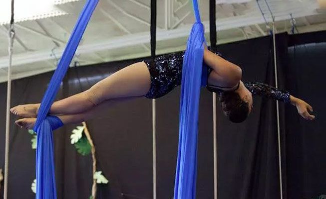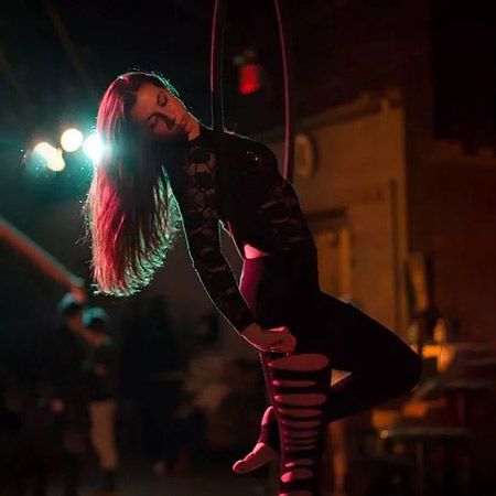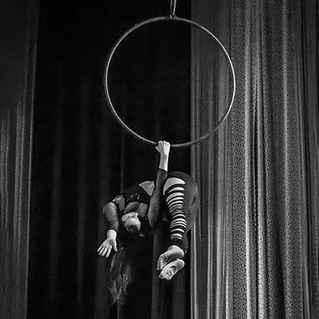 Specializes in Lyra, aerial silks, hoops, trapeze and hammock, cube, and can expertly suspend herself from a range of unique props