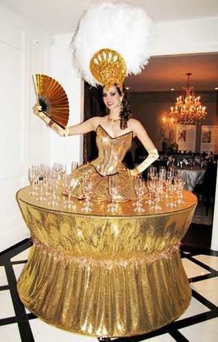 Make a fantastic first impression with our gliding goddesses, who can greet guests with their first cocktail or appetizer. Our stunning strolling tables will bring any room to life as they glide around your event, serving delicious food and adding an extra dynamic to your event decor!