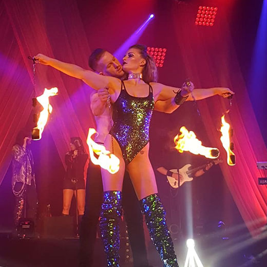 Skills include aerial hoop, aerial straps, fire performances, stilt walking, and more.