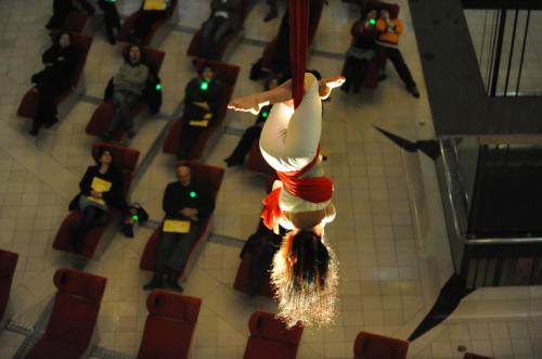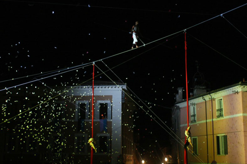 In this unique act, three professional aerialists deliver an extraordinary performance using urban architecture as their stage. Attaching fabrics and cables to man-made structures, they create a complex show that tests their skills and captivates the imaginations of onlookers below.