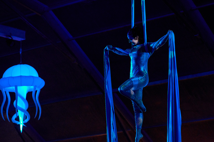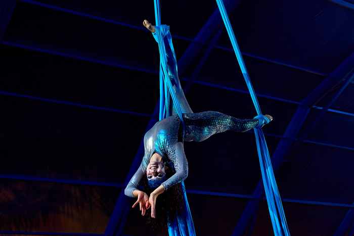 - Underwater Aerialist - Floats elegantly high above the audience in a beautifully choreographed routine. Her costume is decorated with blue and silver rhinestones and a blue fish scale pattern down the side; her silk routines are performed to custom-made underwater-themed music.
