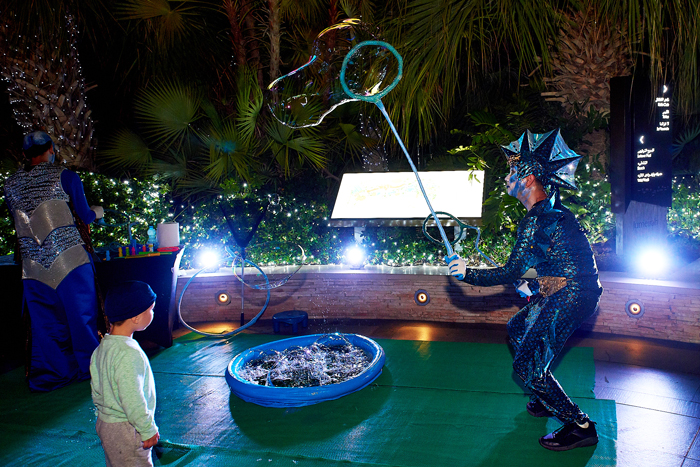 - Amphibi-MAN Bubble Artist - In his sea creature costume, the bubble artist creates a range of bubbles, both big and small.