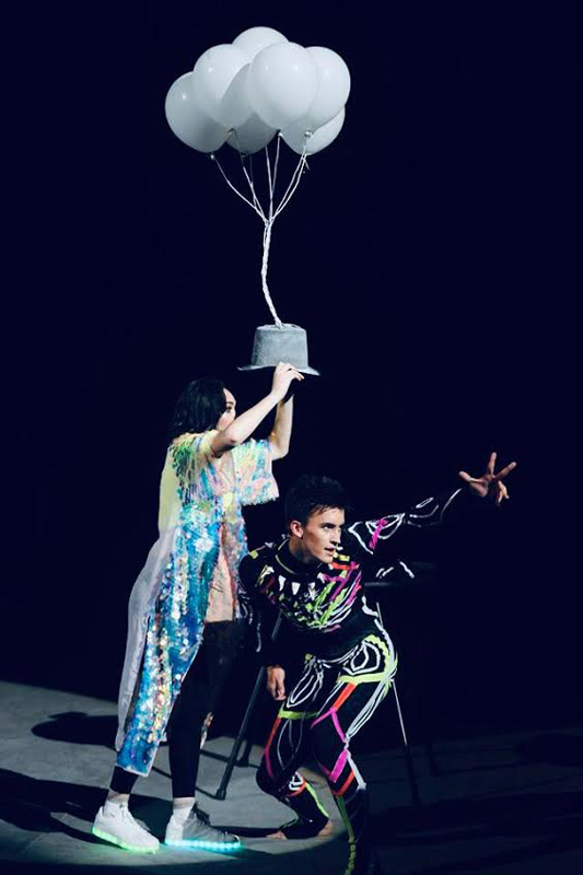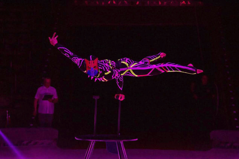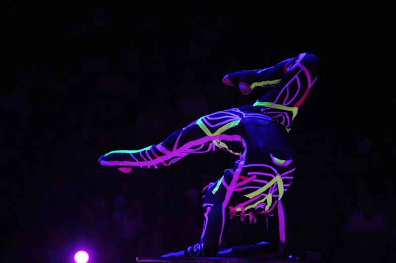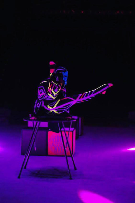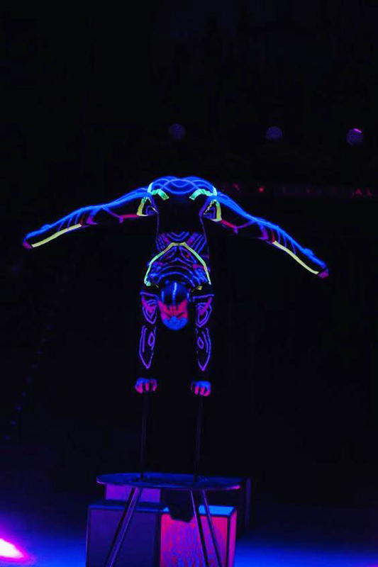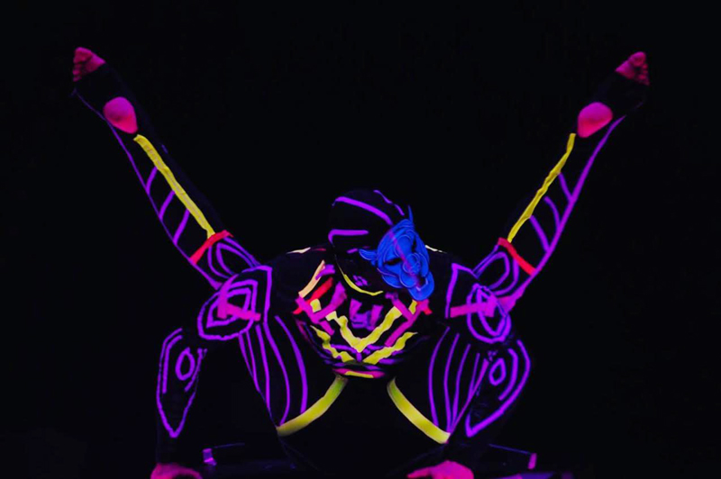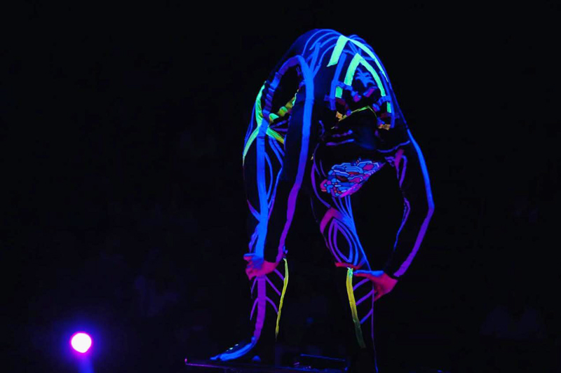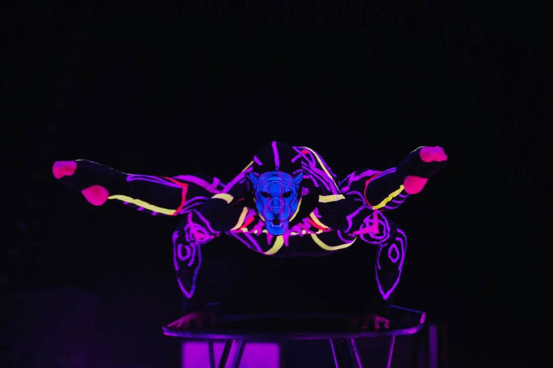 Contortionist in a UV costume and cat mask mesmerizes with his impeccable technique and endless creativity.