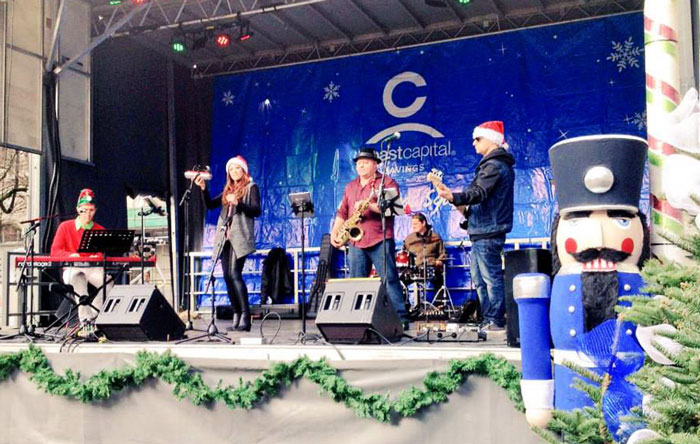 The band features drums, bass, guitar, keyboard, sax, and multiple backing vocals, all led by a highly experienced female singer. She has performed all over the world and served as an anthem singer for various local and national sports teams, as well as high-profile corporate conferences, galas, marathons, and cycling events around town.