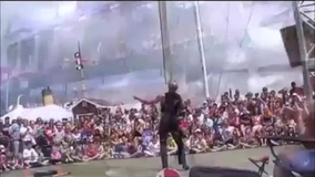 Circus stunts feature rola-bola, swords, knives, and flaming fiddle bows.