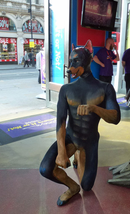 Bringing humor and fun to any event, the roaming dog can try on human accessories like glasses and ties, and even participate in human activities like tennis (check out the video below)! Alternatively, for events that emphasize performance, the human-animal can create an amazing physical resemblance to man’s best friend.