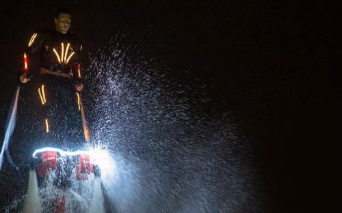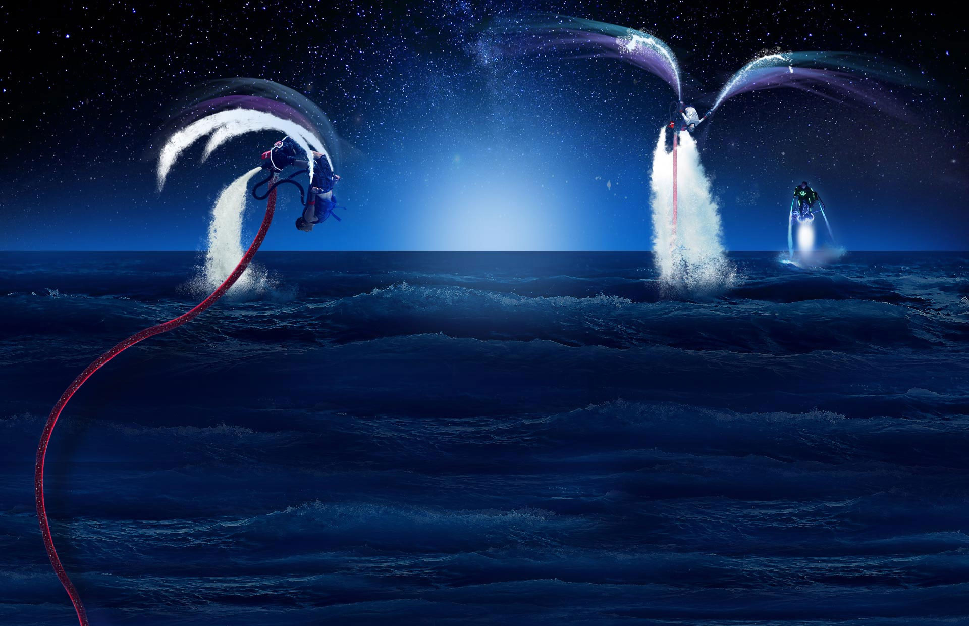 In the dark, giant holograms appear to levitate over the water. Then illuminated Flyboarders break through the water screen, moving towards the audience who realizes these men are real and flying!