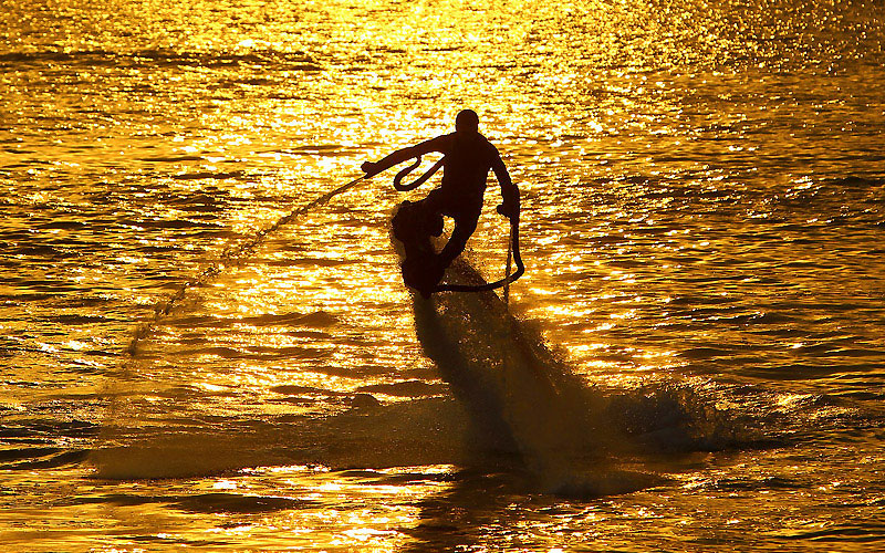 One (or more) Flyboarder(s) can perform many tricks, taking the audience on this unique experience. They dive and swim like dolphins, fly like birds over 12 meters high into the sky!
