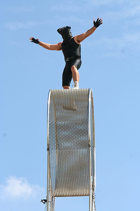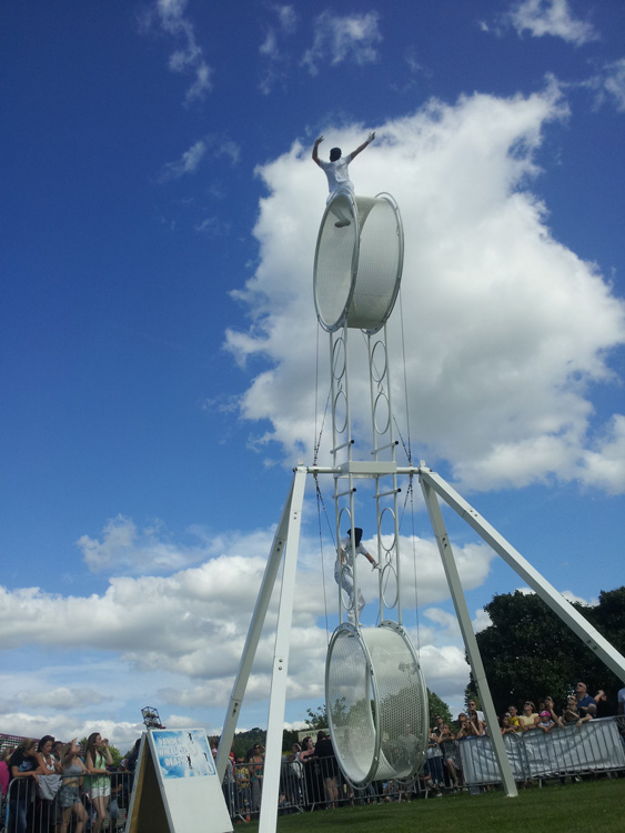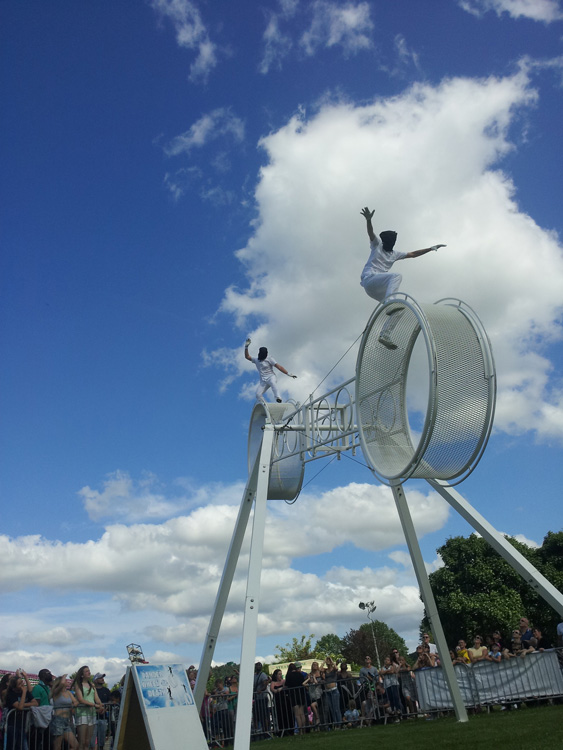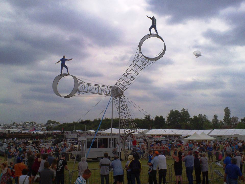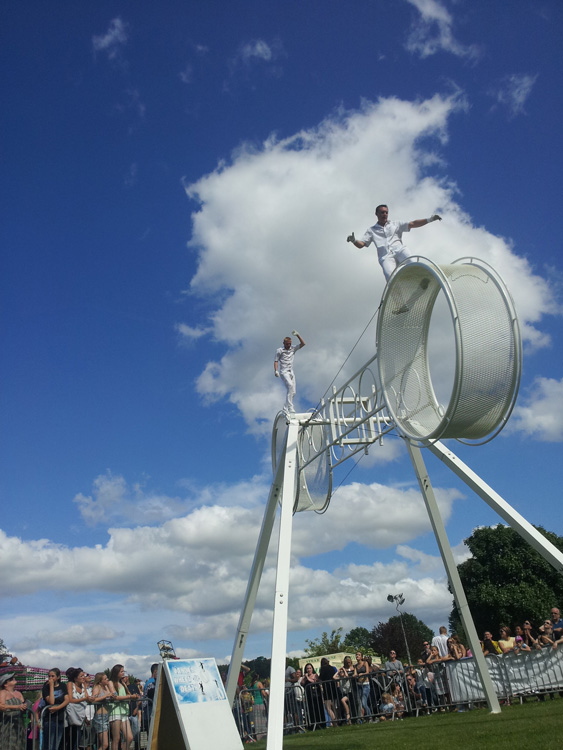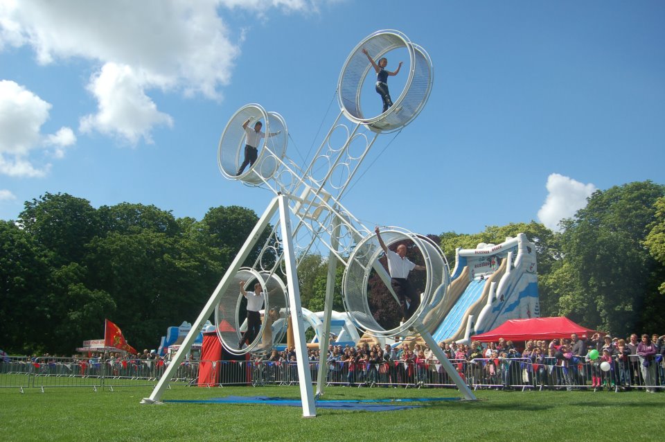 This is one of the best aerial stunt acts in the world, featuring a double and triple "Wheel of Death" display standing a spectacular 50ft high, visible from all corners of your event show ground. This arena display is a huge crowd magnet and will captivate your visitors. This unique act is appearing in Great Britain for the third consecutive year in the outdoor arena entertainment scene, having debuted at the Glastonbury Festival in 1995.