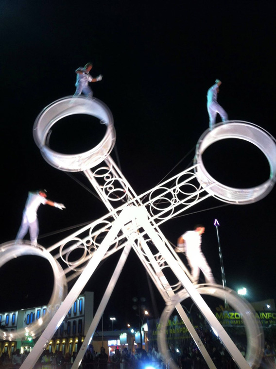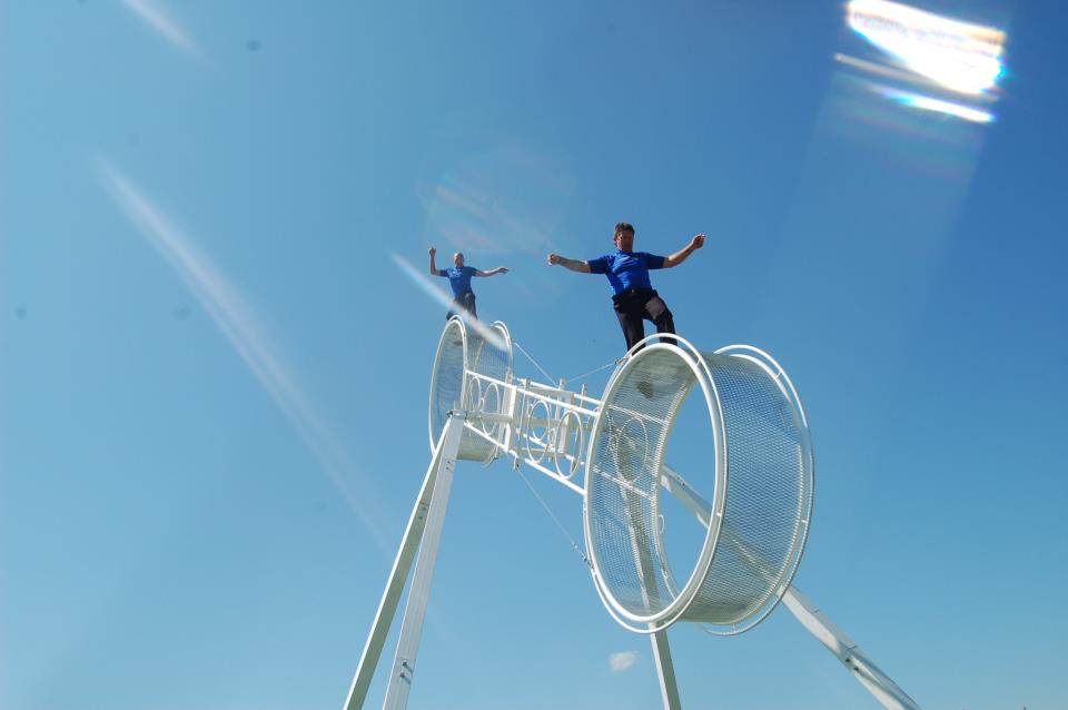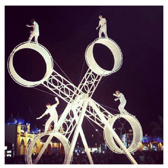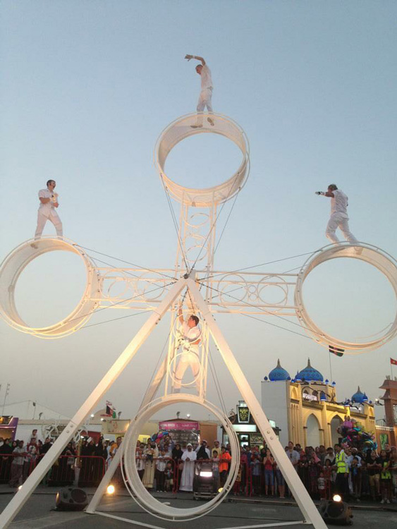 As one of the most prestigious acts on the circuit today, it is the only Triple Wheel known to exist. This 11-meter structure rotates on a central axis with a cage at the end of each spoke. Performers enter the cages and begin to rotate the wheel at an increasing speed, walking, then running inside, then outside the cages.