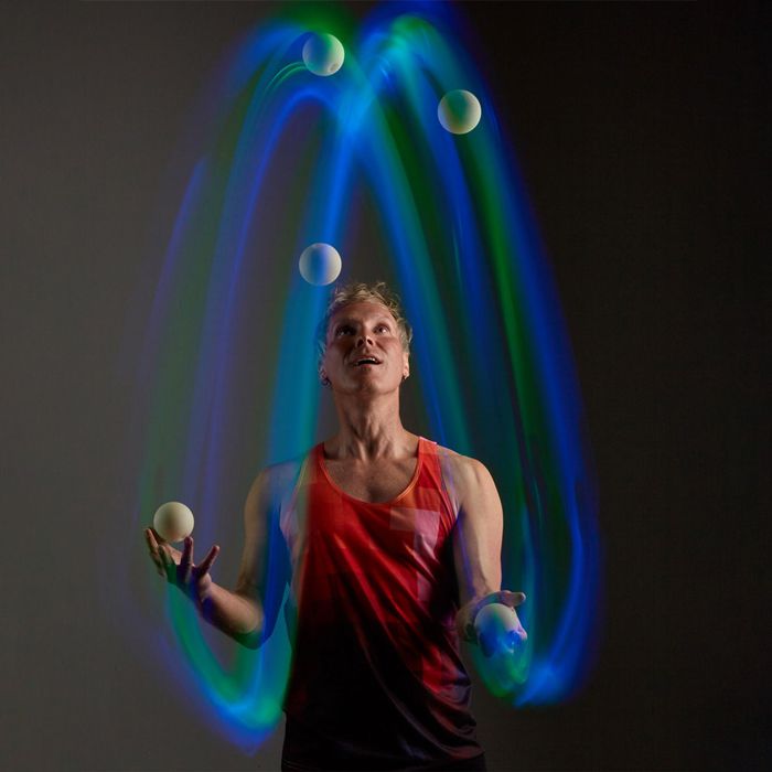 An entirely unique performer, he was the first to juggle three balls with his feet while simultaneously juggling three balls with his hands!
