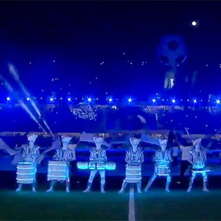 Our bespoke flag and LED dancers waved the client’s chosen flags as part of a dynamic dance routine before illuminating the pitch with LED isis wings. Simultaneously, our LED Drummers stood proudly on the football pitch hammering explosive beats on LED drums that echoed throughout the stadium as their illuminated costumes caught the eyes of spectators in the stands. At the same time, our flying helium-filled balloon, ingeniously disguised as a giant football, supported the impressive acrobatic feats of the sensational aerialist suspended from it. Together, we created a visual spectacle of colour, light and sound that celebrated the start of the popular sports tournament in style.
